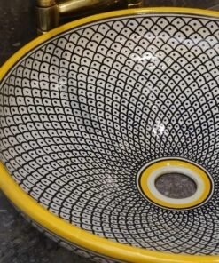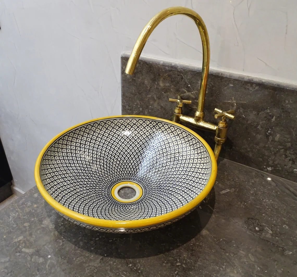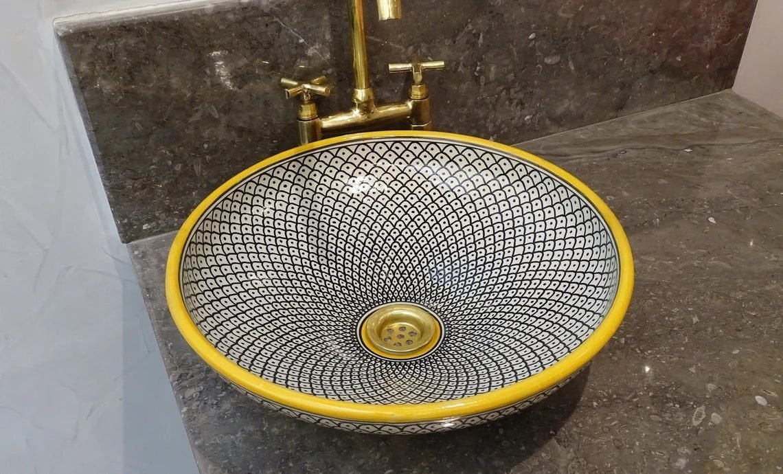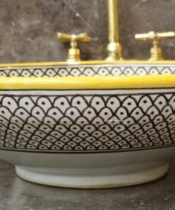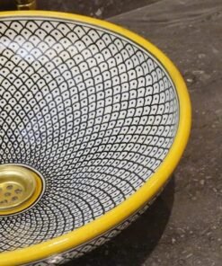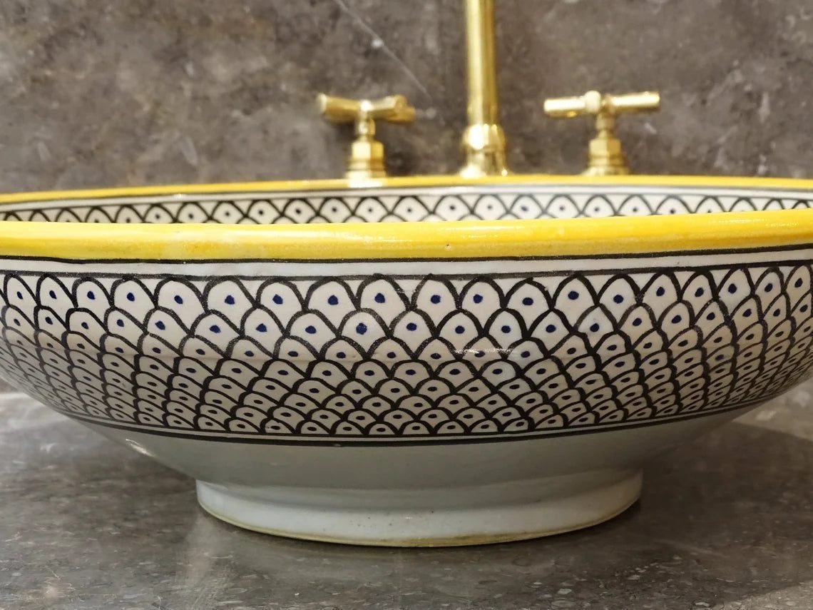 this amazing traditional Moroccan sink was handcrafted by professional workers, it represents the cultural diversity of Moroccan handcrafts and that is because of its design, material and the natural colors used at the surface of the sink, the height of this amazing piece of art is 12cm/4.7inch with the possibility of personal customization. by obtaining such objects you would be helping a dying craft to flourish again so that contact between the past and the present would never die not mentioning the happiness it would bring to poor workers on fields like this .