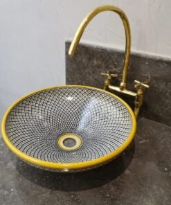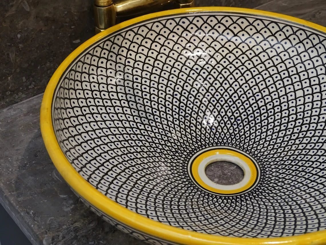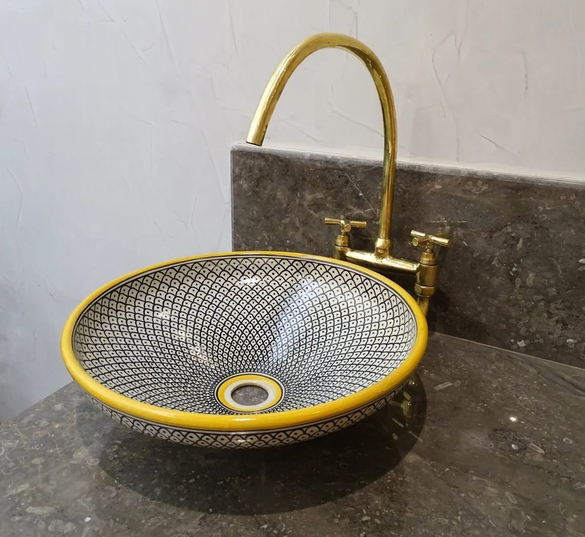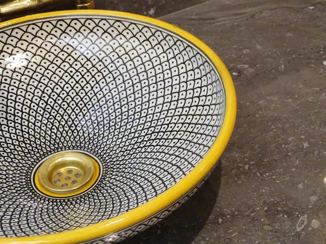 this amazing traditional Moroccan sink was handcrafted by professional workers, it represents the cultural diversity of Moroccan handcrafts and that is because of its design, material and the natural colors used at the surface of the sink, the height of this amazing piece of art is 12cm/4.7inch with the possibility of personal customization. by obtaining such objects you would be helping a dying craft to flourish again so that contact between the past and the present would never die not mentioning the happiness it would bring to poor workers on fields like this .
